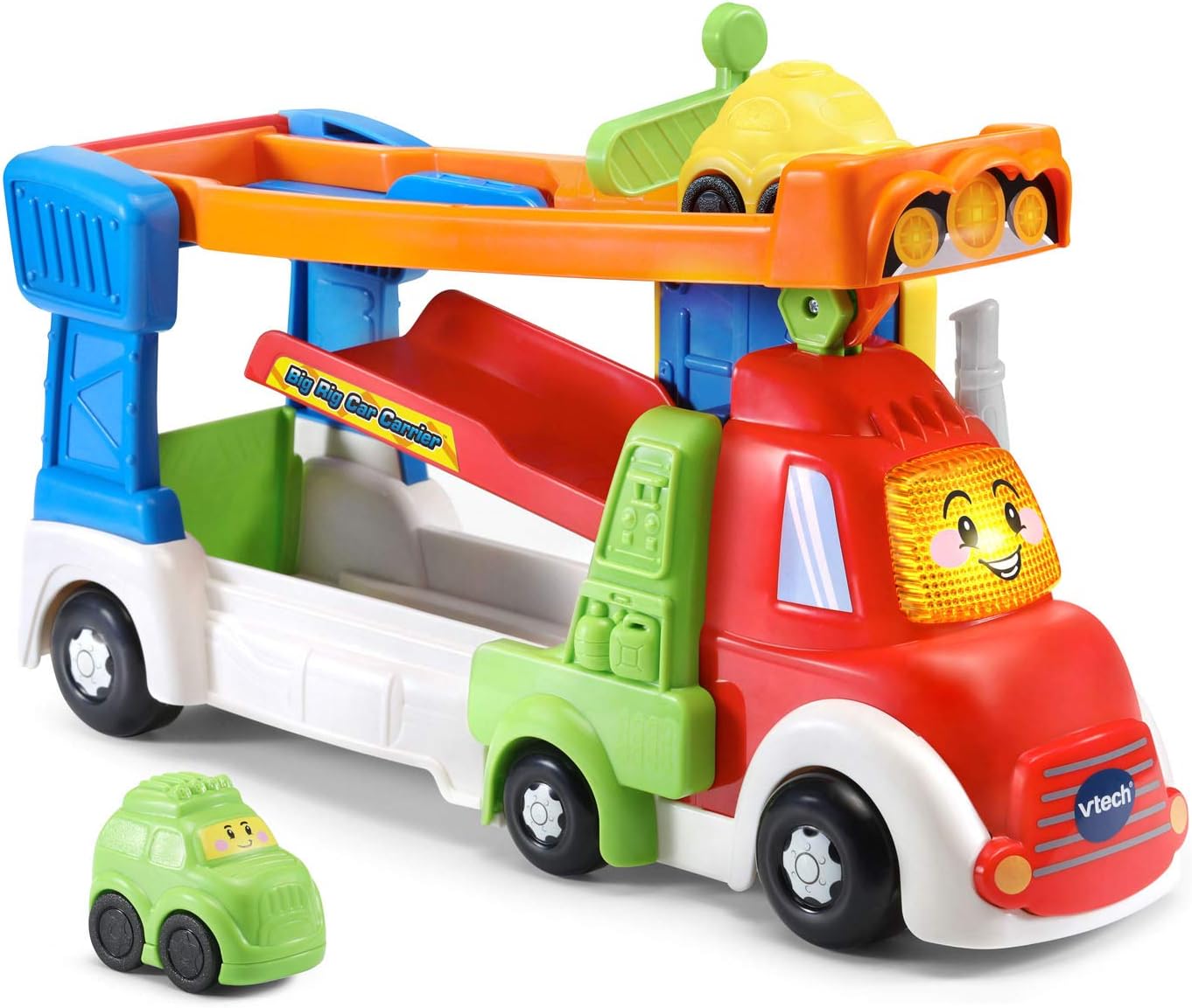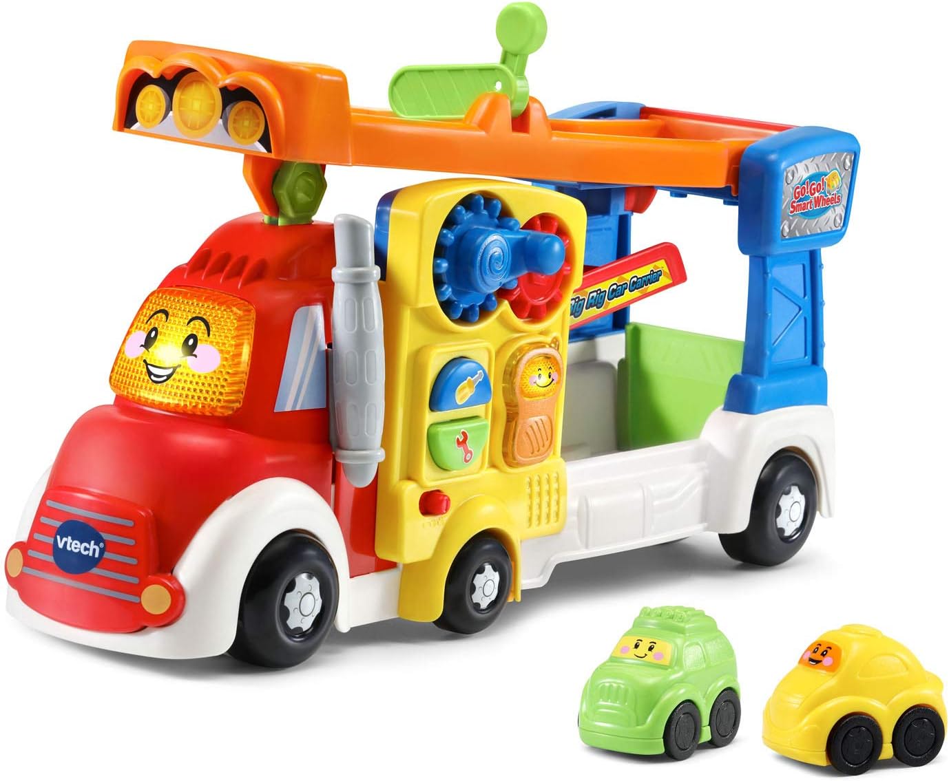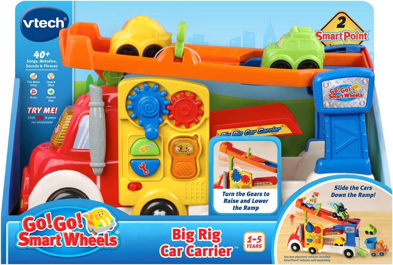 Tow and haul like a pro with the Go! Go! Smart Wheels big rig car carrier! The track at the top of this electronic semi-truck converts to a ramp that lets the included non-electric vehicles zigzag to the bottom. With spinning gears and a light-up windshield, this toy car carrier helps little truckers build fine motor skills. When you place a go! Go! Smart Wheels smart point vehicle (sold separately) on one of the two smart point locations, The vehicles will respond with sound effects, lights and music designed to keep your child engaged. When your child isn’t launching vehicles down the ramp, this interactive car carrier can haul and store up to three vehicles. Hit the road with the Go! Go! Smart Wheels big rig car carrier! Intended for ages 1-5. Requires 2 AAA batteries. Batteries are included for demo purposes only.