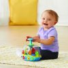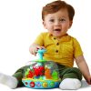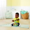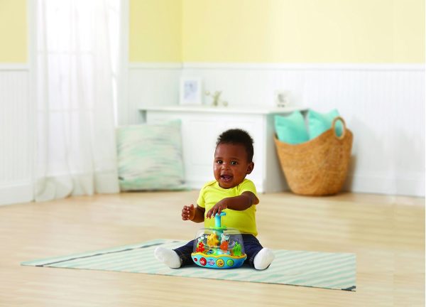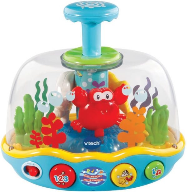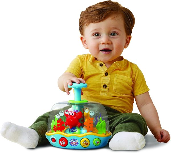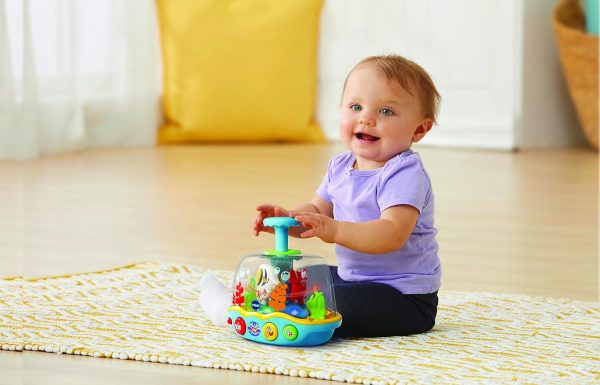 Dive into fun with the learn & spin aquarium. Press the blue water spout and watch it spin, light up and play music. Adorable ocean Friends playfully swim and spin in the aquarium while the lights flash. Each time the plunger is pressed you will hear a playful phrase, a fun sound or a short tune. Three colorful buttons introduce animals, colors, numbers and play music. Listen to cheerful songs sung by the crab, fish and starfish. Make a splash with these spinning ocean Friends!