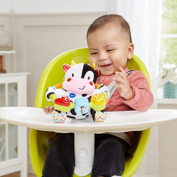 - Plush cow has soft fabric and textures that enhance tactile awareness