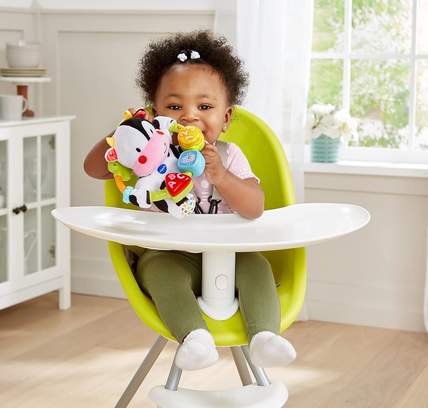 Cuddle and learn with the Lil’ Critters Moosical Beads by VTech. Press the light-up buttons or spin the square bead to hear cheerful songs and phrases that teach shapes, colors, numbers and letters. The plush cow features a variety of fabric textures to develop tactile awareness, and the easy-to-grasp ring strengthens motor skills. Your little one will have a moosical good time.