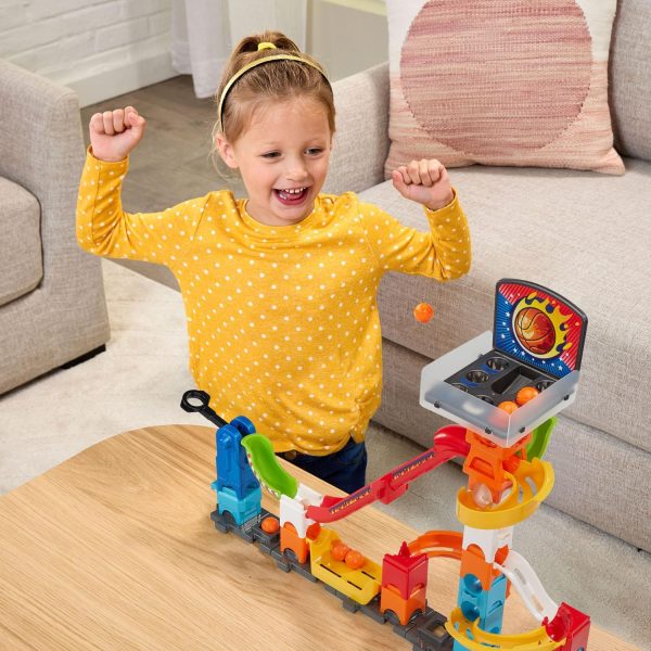 Launch three-point shots in a head-to-head basketball challenge! Create three buzzer-beating builds using the easy-to-follow leveled guide by connecting the 41 color-coded pieces including two rotatable launchers, basketball hoop and exciting tracks! Create your own courses to explore STEAM (Science, Technology, Engineering, Art and Math) skills. When the gravity-fed course is complete, start the competition by taking turns launching the six marbles towards the basketball hoop. Fill three rings in a row to win a game of tic-tac-free-throw. The hoop also has a rapid return that sends marbles speeding through the course. Combine with other Marble Rush sets (each sold separately) to create an extreme playset. Find more build ideas at the VTech Kids website. Intended for ages 4+ years. Batteries not required.