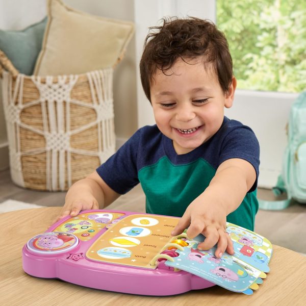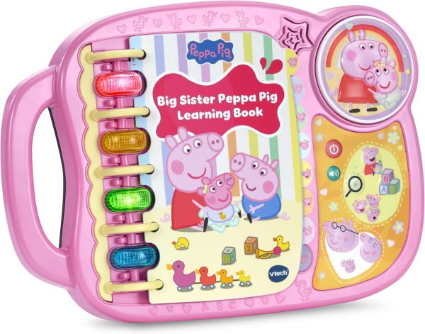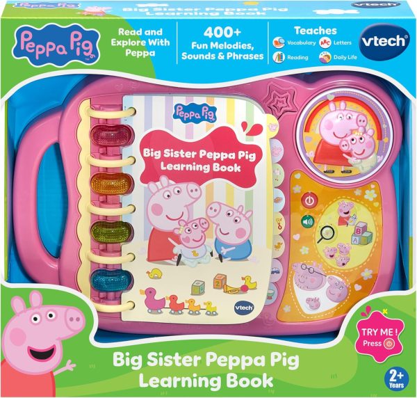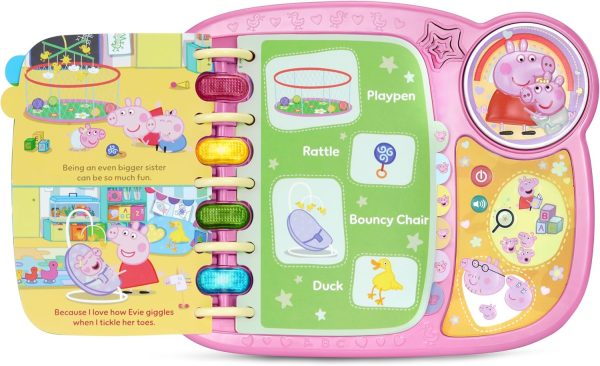Taking care of little Evie keeps everyone busy! Hear Peppa talk about her even bigger sister life by listening to her read each page of the brightly illustrated book. Discover how Peppa helps take care of Evie while exploring letters and new words. Answer questions, play sounds and interact with the pages by pressing the light-up buttons. Hear sounds and phrases from the whole family by pressing Peppa and Evie, Mummy, Daddy and George buttons. Peppa’s the best big sister ever! Intended for ages 2+ years. Requires 2 AA batteries. Batteries included for demo purposes only. New batteries recommended for regular use.