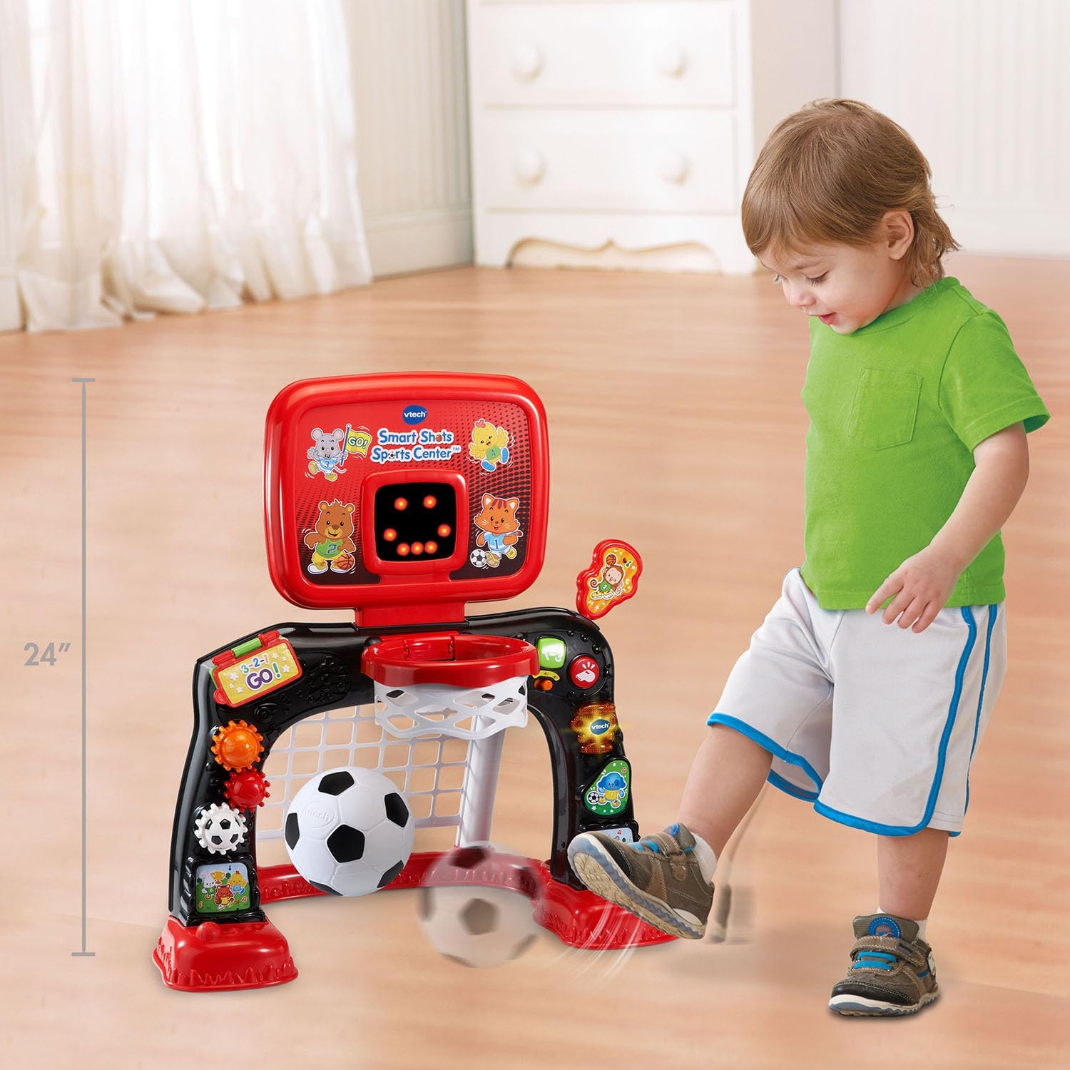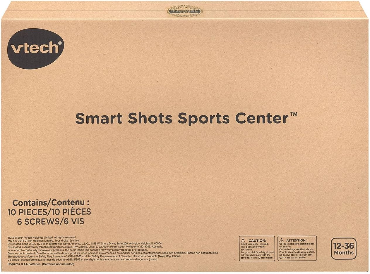 Cheer on your little sports star with the Smart Shots Sports Center™, only at ! This electronic sports center features a soccer net and basketball hoop for a fun 2-in-1 play experience. Toss the basketball into the hoop and watch as the LED screen counts the number of baskets. Kick the soccer ball into the net, and the sports center will respond with encouraging sounds and phrases. In addition to counting baskets, the LED screen also encourages play with fun animations. Build fine motor skills with a variety of manipulative features. Turn the gears to hear playful sounds and press the shape buttons to learn shapes, numbers and hear fun sounds. Score, learn and win with the Smart Shots Sports Center! Intended for ages 12-36 months. Requires 3 AA batteries. Batteries included for demo purposes only. New batteries recommended for regular use.