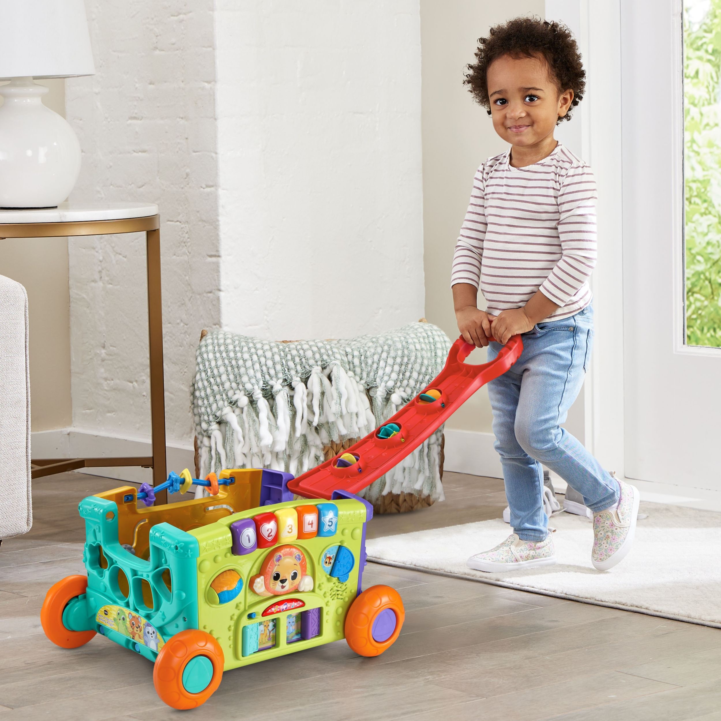 The Vtech® Sort & Discover Activity Wagon is a wagon full of fun and exploration. Each side offers engaging activities like shape sorting, gear spinners, electronic activity keys, mazes, and peek-a-boo doors, sparking curiosity and learning through play. Little adventurers can load up their favourite toys, snacks, and stuffies as they roll out on their next big adventure. Whether pushing or pulling the wagon, kids are rewarded with cheerful music and sound effects to keep the excitement going. For added fun, fold over the handle to create a bonus fifth side with colourful spinners. Plus, it makes storage a breeze. The Sort & Discover Activity Wagon is a playful, interactive way to keep little ones entertained and on the move.