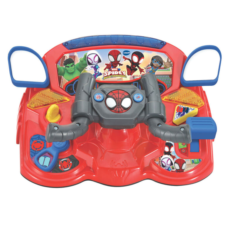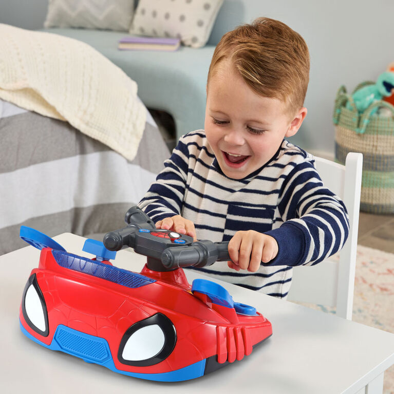 Meet the Spidey team from the hit MARVEL show Spidey and his Amazing Friends, and see what this 2-in-1 driver can do! Turn the hand grips and easily transform the vehicle between Spidey’s Web-Crawler and Spin’s Techno-Racer. Practice driving each vehicle while exploring the rules of the road. Learn about Spidey and his friends Spin, Ghost-Spider, Ms. Marvel and Hulk by pressing the WEB-Ster or character buttons. Team up with Spidey to play seven thrilling games and follow instructions to complete missions – like rescuing a puppy or stopping super-villains such as Doc Ock, Green Goblin, and Rhino. What a ride! Intended for ages 3+ years. Requires 2 AA batteries. Batteries included for demo purposes only. New batteries recommended for regular use.