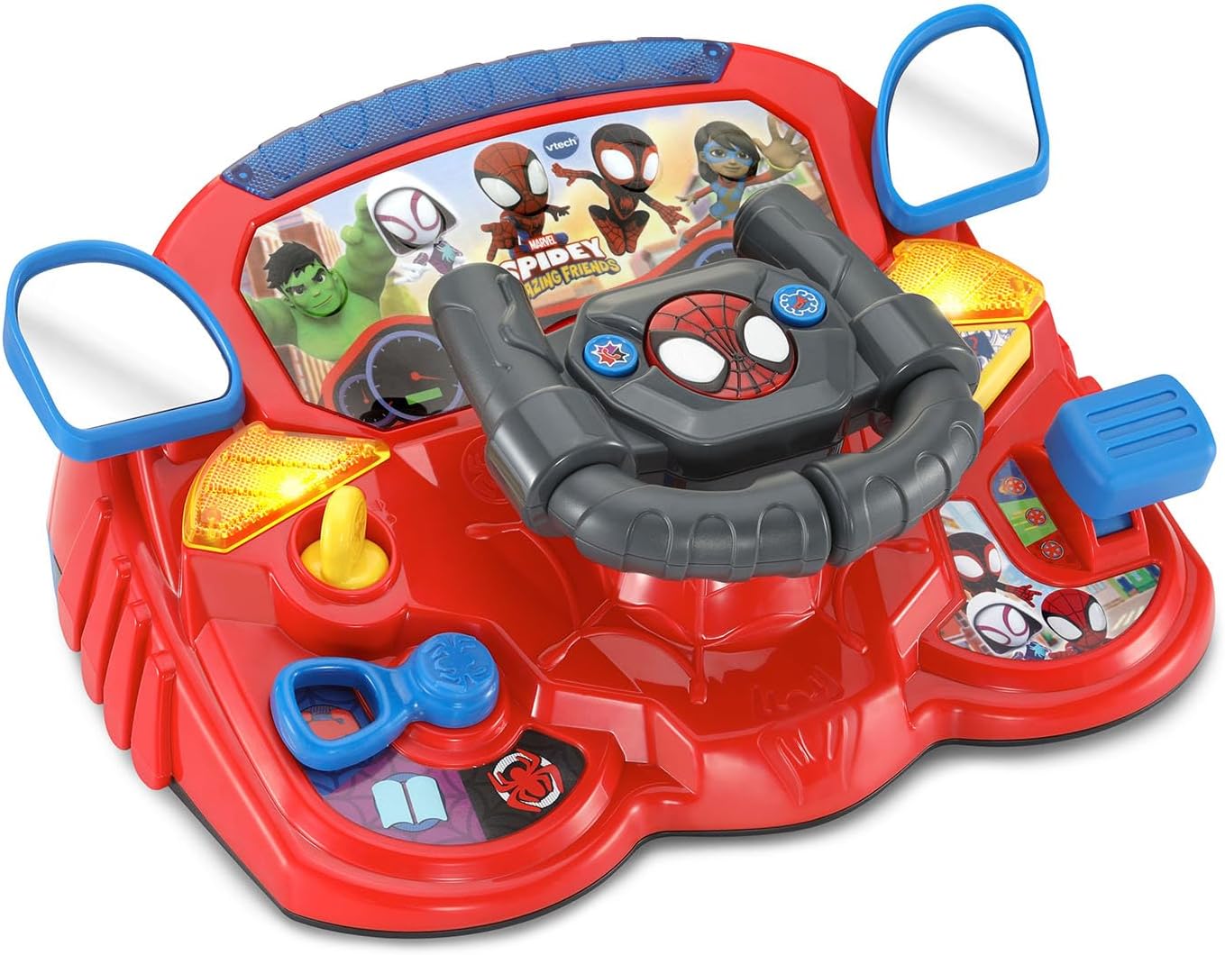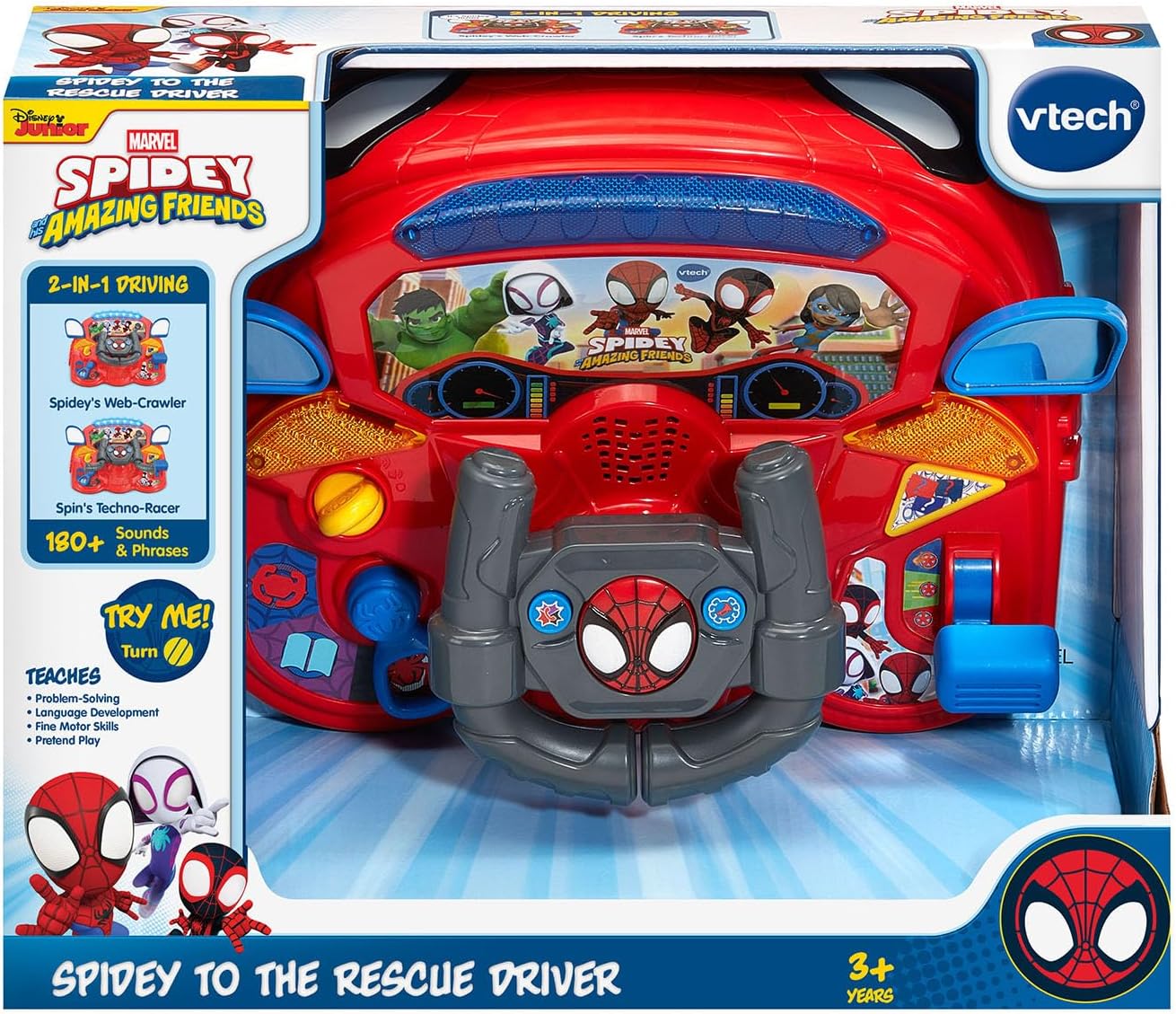 Meet the Spidey team from the hit MARVEL show Spidey and his Amazing Friends, and see what this 2-in-1 driver can do! Turn the hand grips and easily transform the vehicle between Spidey’s Web-Crawler and Spin’s Techno-Racer. Practice driving each vehicle while exploring the rules of the road. Learn about Spidey and his friends Spin, Ghost-Spider, Ms. Marvel and Hulk by pressing the WEB-Ster or character buttons. Team up with Spidey to play seven thrilling games and follow instructions to complete missions—like rescuing a puppy or stopping super-villains such as Doc Ock, Green Goblin, and Rhino. What a ride! Intended for ages 3+ years. Requires 2 AA batteries. Batteries included for demo purposes only. New batteries recommended for regular use.