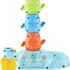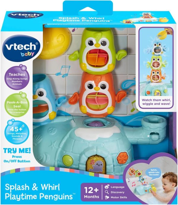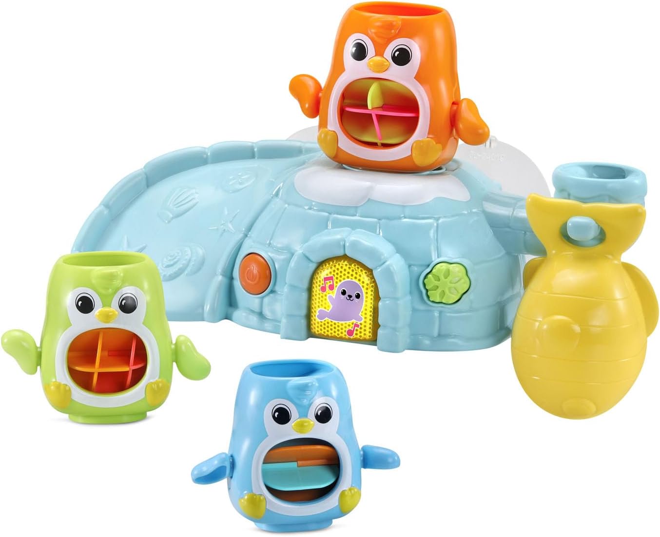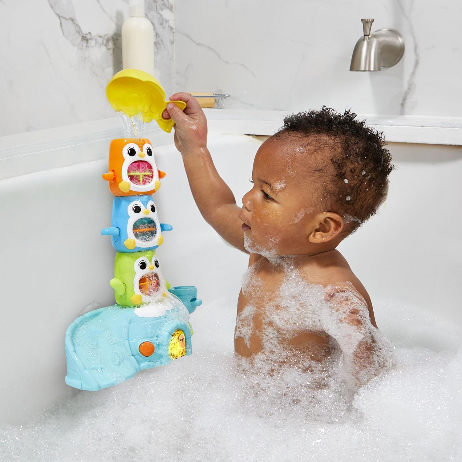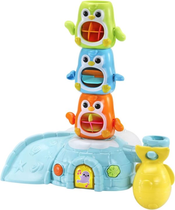 - It’s a penguin pile-up! Build fine motor skills by stacking up the trio and pouring in water to watch them wiggle, whirl and wave
