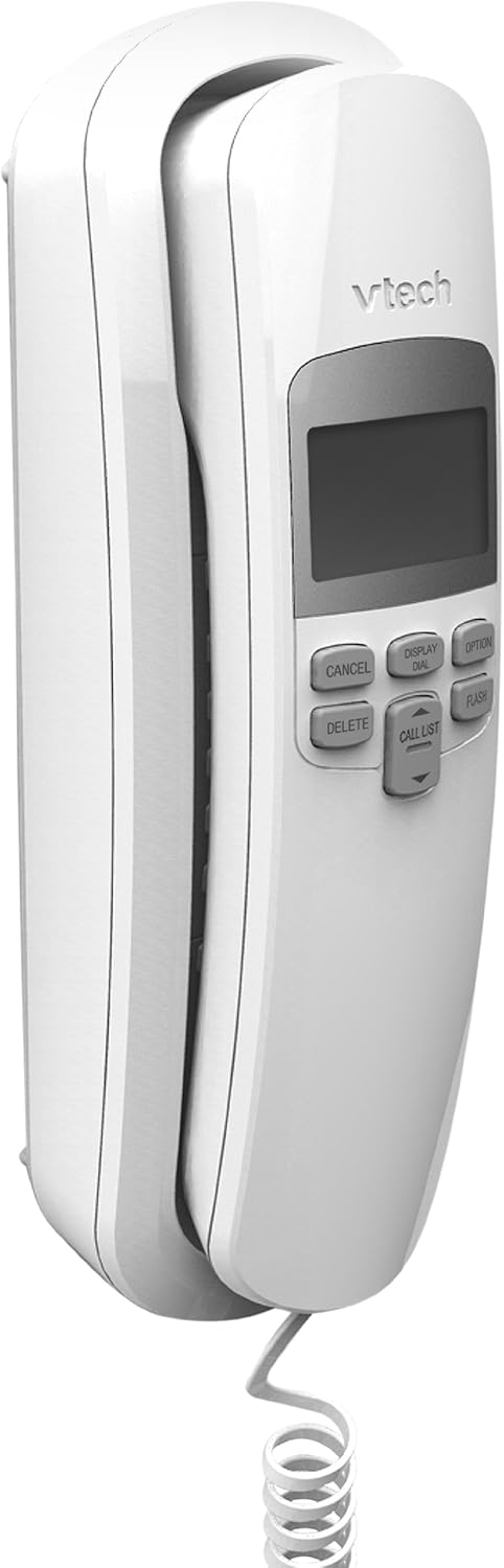 For a reliable home phone that is great for everyday use and in emergencies, be sure to use the slim VTech Trimstyle Corded Telephone in White. This simple phone is designed to save you space, with the keypad buttons on the inside of the receiver and the screen and featured buttons on the back. Take advantage of the caller ID to avoid telemarketers, or use the call waiting function to easily switch between calls. This phone can still be used in a power outage in case of emergencies, as basic phone operation runs off telephone line power. 3 AA batteries will power extra features like Caller ID, Clock, LCD, but are not required to place or receive calls. 3 Speed Dials keys are perfect for those emergency numbers with the touch of a button. Ringer Volume can be turned on/off with the slide of a button on the edge of the phone, if you need the phone to be silent. 3 levels of handset volume level can be selected (low, med, high) to your preference. Switch from Pulse-Rotary to Touch Tone dialing with the press of the Star (*) key if you have a legacy older phone line but still need to type in numbers into an automated service like banking. 80 Caller ID memory shows the last 80 calls, up to 13 digits of their phone number, and up to 16 letters of their name, with date/time stamp. Perfect for keeping a record of who called recently, and letting you call them back with the touch of a button. Last Number Redial, Mute and Flash round off the extra features this Trimstyle phone offers.