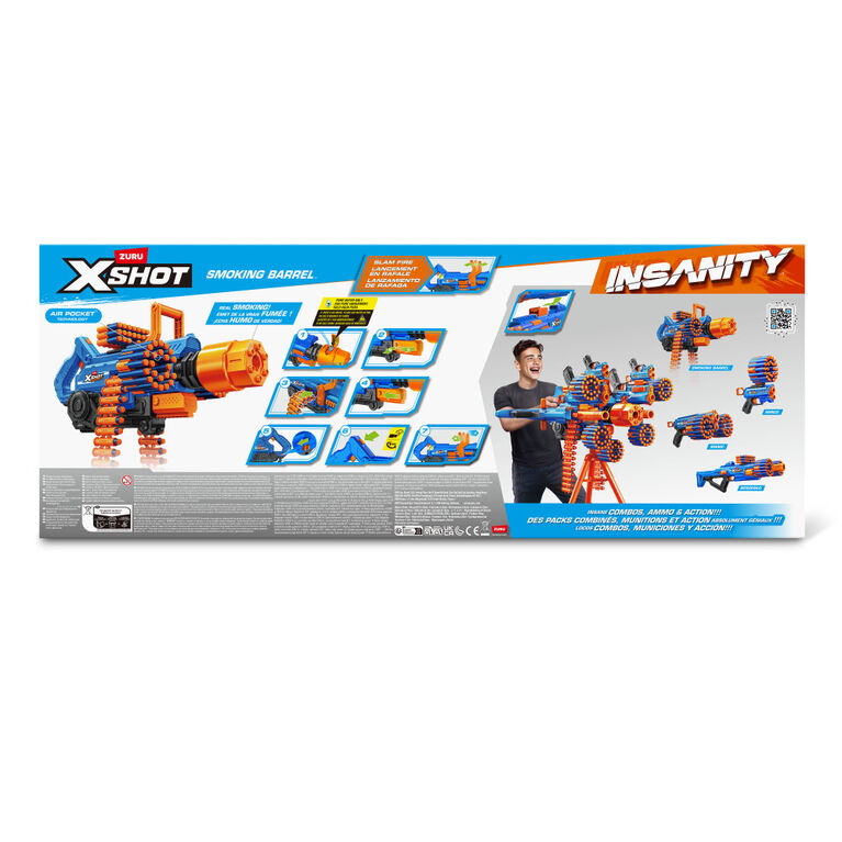 Introducing the most thrilling addition to the XSHOT Insanity arsenal: the Smoking Barrel. Watch as the blaster springs to life, emitting captivating smoke and lighting up each time a dart is fired! Elevate your blaster battles with friends, launching Air Pocket Technology darts up to 90 ft/27m and making a dramatic statement with the smoking barrel as your ultimate finishing move. Where there’s smoke, there’s epic blaster action! Connect this innovative blaster with the rest of the Insanity range to create INSANE combos for a truly unmatched, NEXT LEVEL, and insanely cool experience. The more blasters you add to your Insanity arsenal, the more action-packed and exciting the fun becomes! Perfect for outdoor or open spaces this blaster will enhance your performance. With darts flying up to 90 feet the Smoking Barrel is recommended for ages 8+.